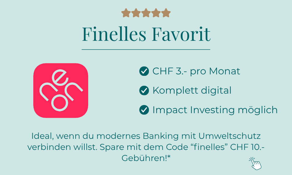 | NEON green (Nutze den Code “finelles” und spare 10.- Gebühren.) | Neo / Digital Bank Spezielles “grünes” Add-on von NEON, wo z.B. pro CHF 500.-, die du mit deiner Karte ausgibst, ein Baum gepflanzt wird und ein Klimaschutzausgleich der Bank für dein Konto erfolgt Ermöglicht Impact Investing über inyova |